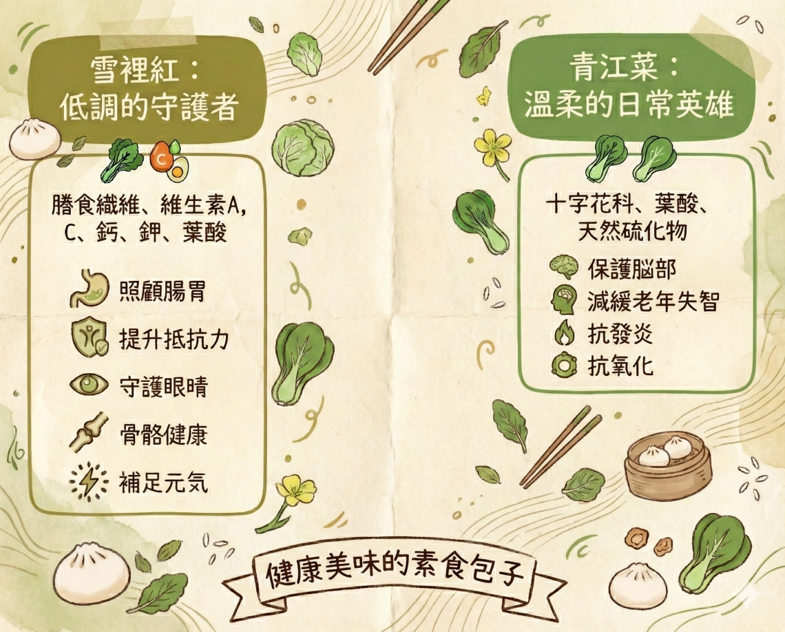 青江菜則是溫柔又強韌的小綠手,屬於十字花科蔬菜,富含葉酸與天然硫化物。長期食用,不但能幫助保護腦部、減緩老年失智風險,還能帶來抗發炎、抗氧化的好處。它的存在,像是默默守護你健康的日常小英雄。